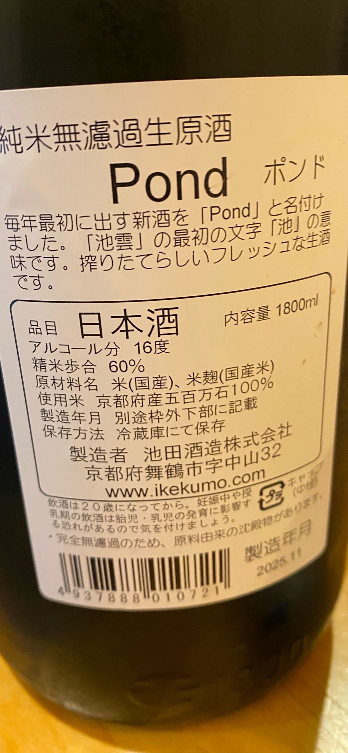 無濾過生原酒。飲んだ後に鼻から抜けていく感じがたまらない!