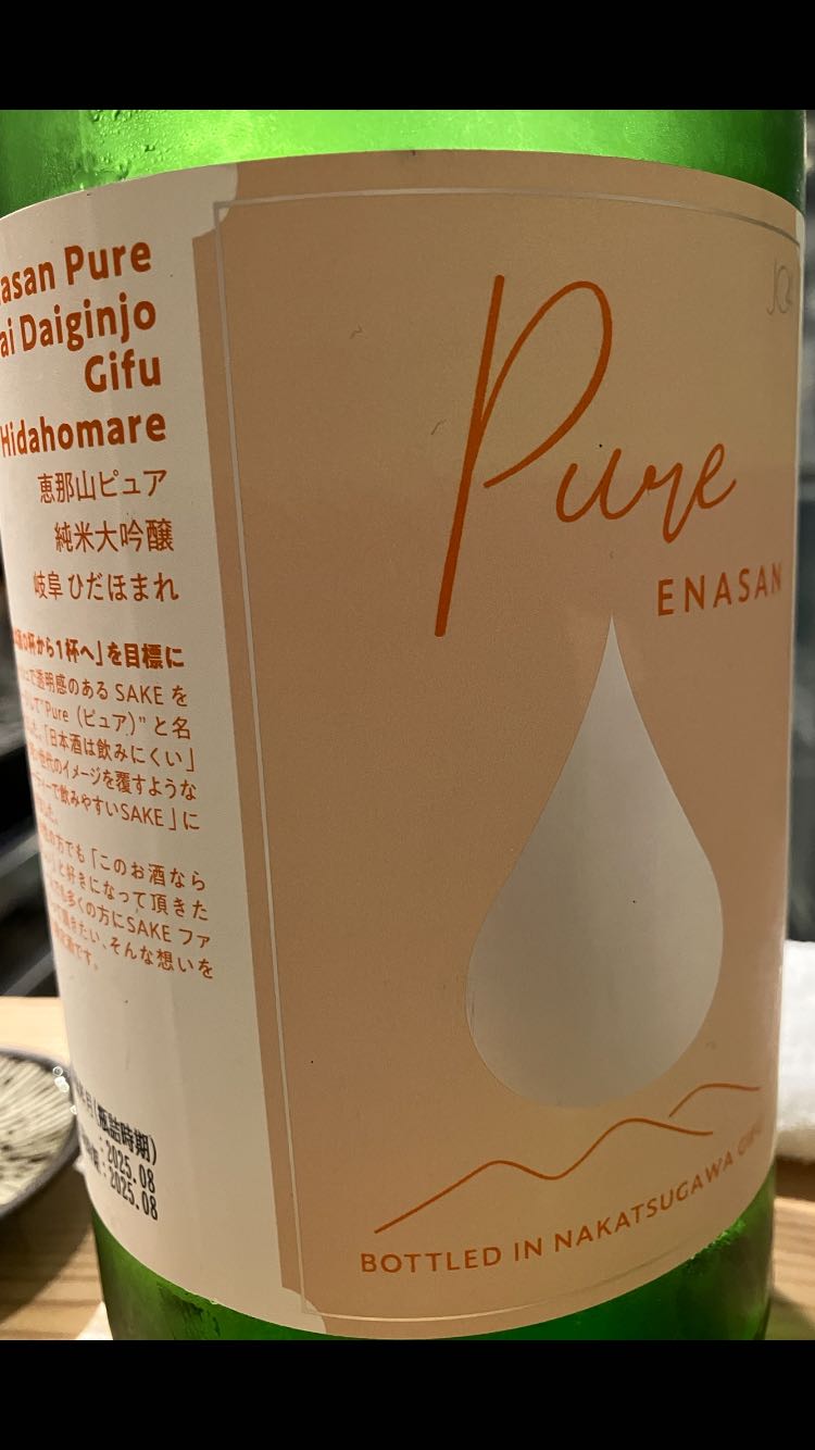 7/8日に飲みました。岐阜は中津川市 はざま酒造 恵那山 純米酒。キレのある飲み口。華やかな酸味が立つ甘みがあり、とても旨口です。