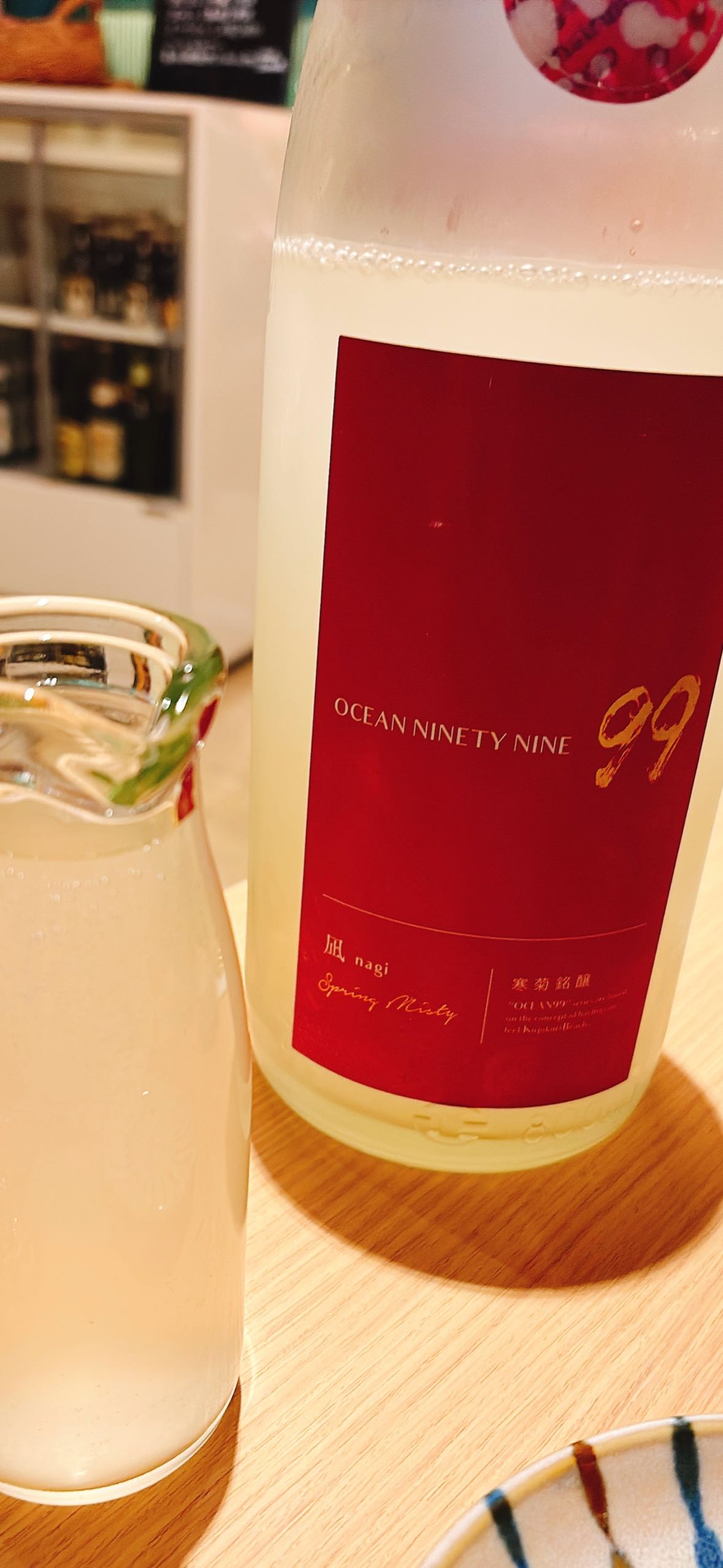 寒菊 OCEAN 99 凪 Spring Mistyは、うすにごりの無濾過生原酒で、五百万石を使用した純米大吟醸。最初は微炭酸で酸味がありますが、時間が経つと味が円やかになります。バナナの香りがあり、旨辛な焼き物に合います。派手過ぎずバランスの良い飲み口で、フルーティーで飲みやすい美味しい日本酒です。