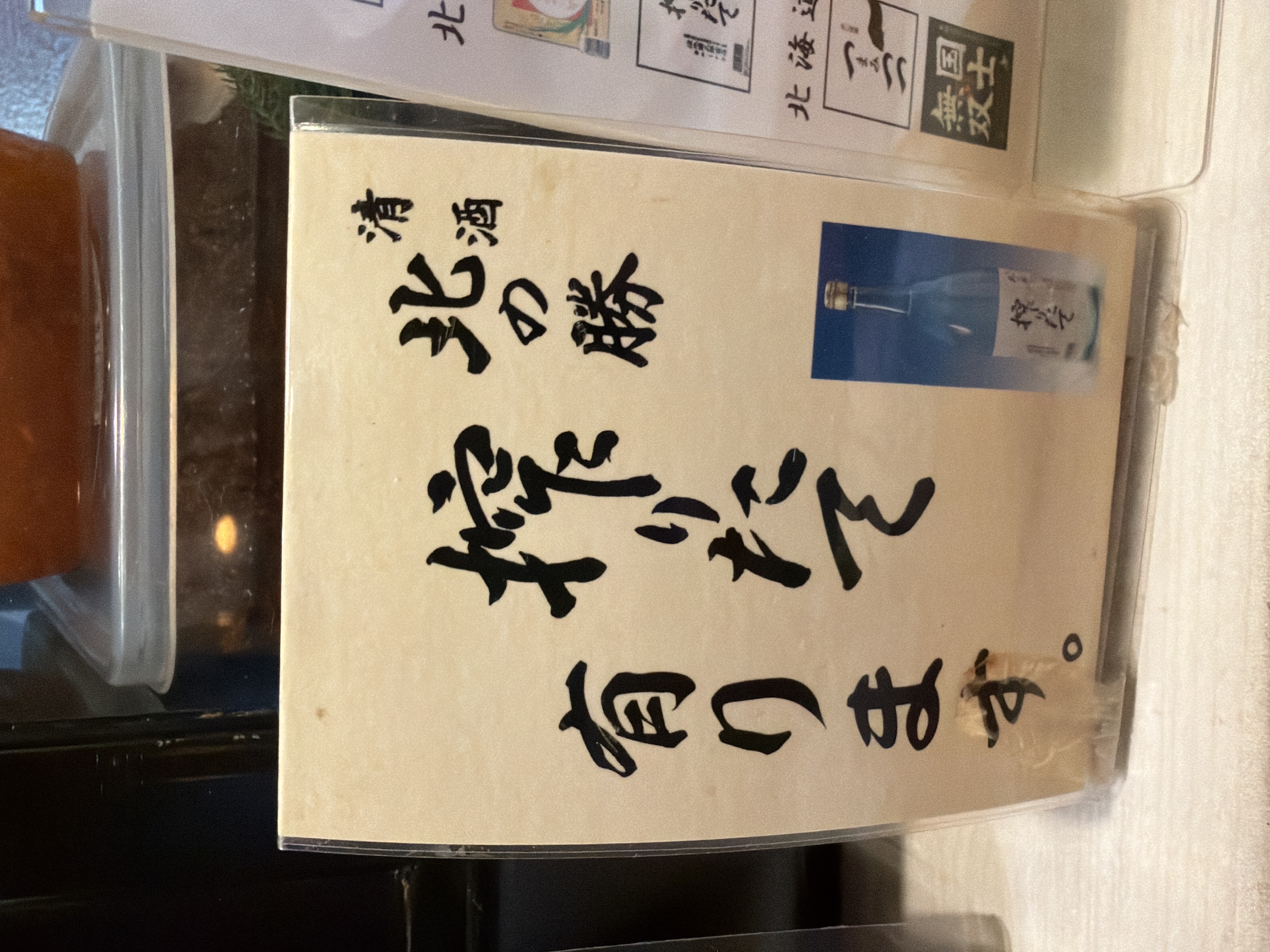 北の勝 普通酒? こちらは北海道根室の地酒です。今回は非常に冷えたものを頂きました。根室で飲んだからありがたみが大きく、ひいき目になってしまうな。香りは日本酒!味も日本酒!良くも悪くも日本酒!なんて言うと今の時代は失礼なのかな?