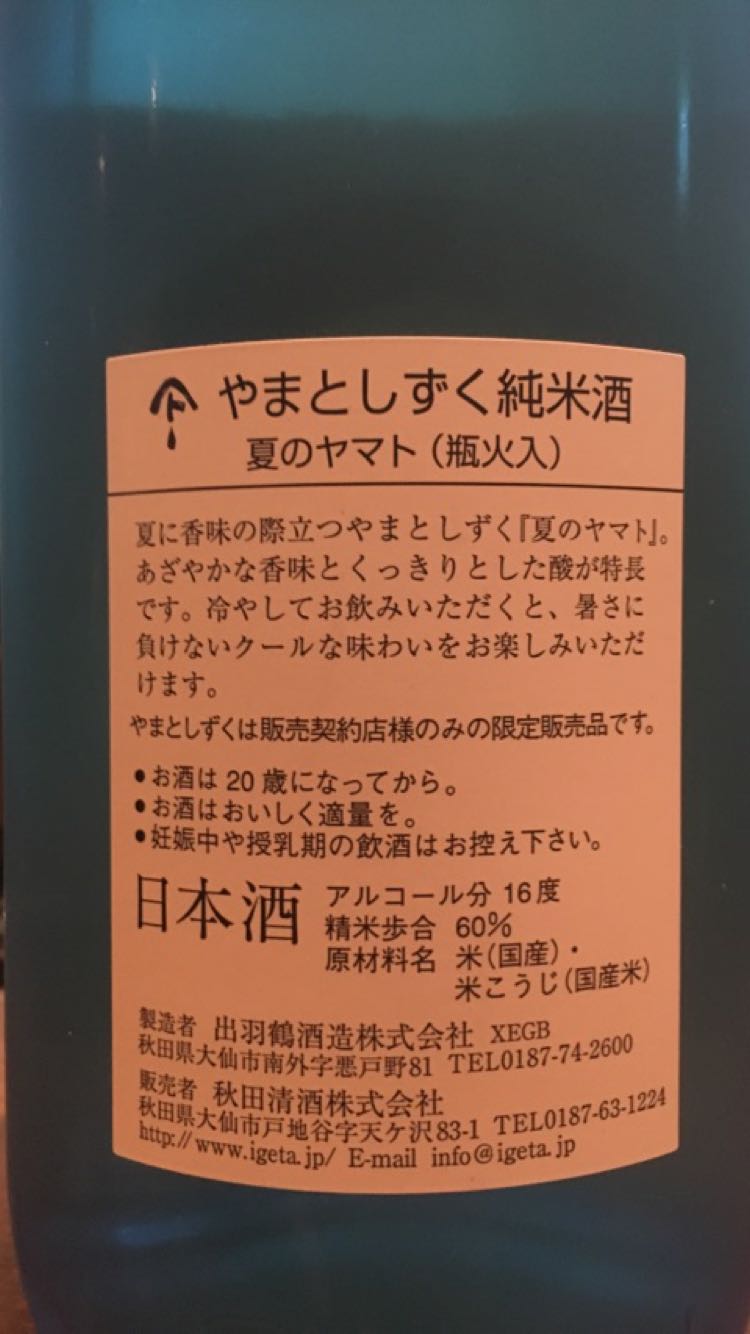 夏のヤマト純米酒。酸味やや甘にがすっきり。